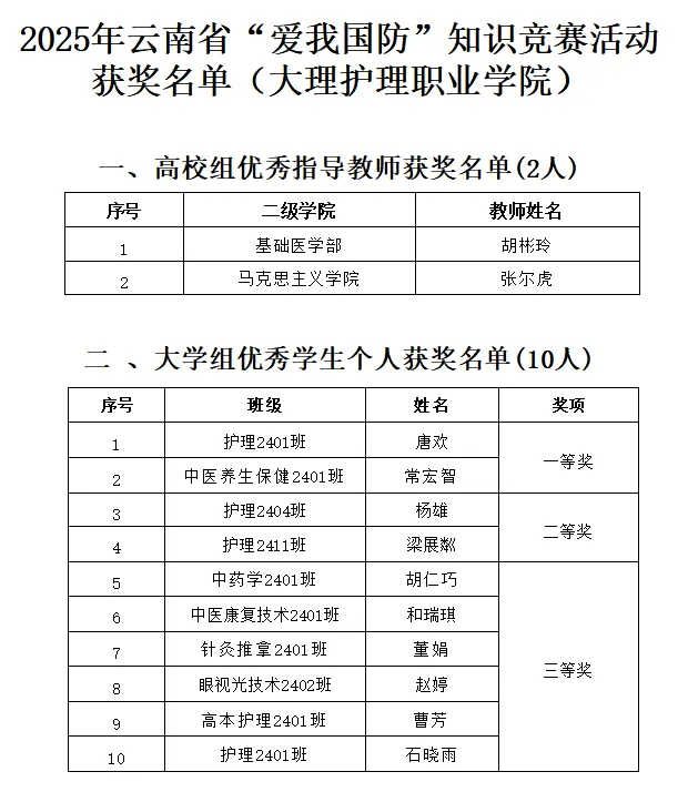 近日,中共云南省委宣传部、云南省教育厅联合发布《关于2025年云南省“爱我国防”知识竞赛活动获奖情况的通报》,对竞赛中表现优异的单位和个人予以表彰。我校学子在本次竞赛中展现出良好的国防知识素养,取得优异成绩。其中,10名学生分别荣获一等奖、二等奖和三等奖,2名教师获评“优秀指导教师”,特此祝贺!